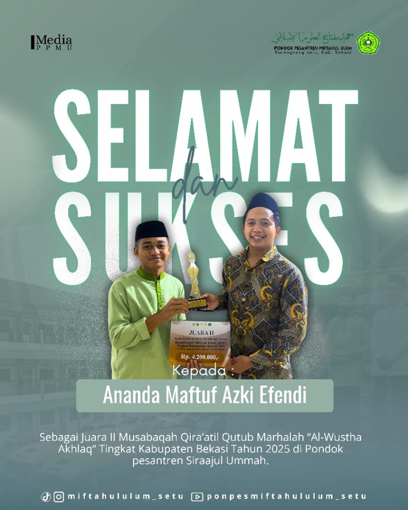 Pada tanggal 17 September 2025, Pondok Pesantren Miftahul Ulum Setu Bekasi kembali menorehkan prestasi di tingkat kabupaten. Ananda Maftuf Azki Efendi berhasil meraih Juara II Musabaqah Qira`atil Kutub Marhalah "Al-Wustha Akhlaq" yang diselenggarakan di Pondok Pesantren Siraajul Ummah, Kabupaten Bekasi.